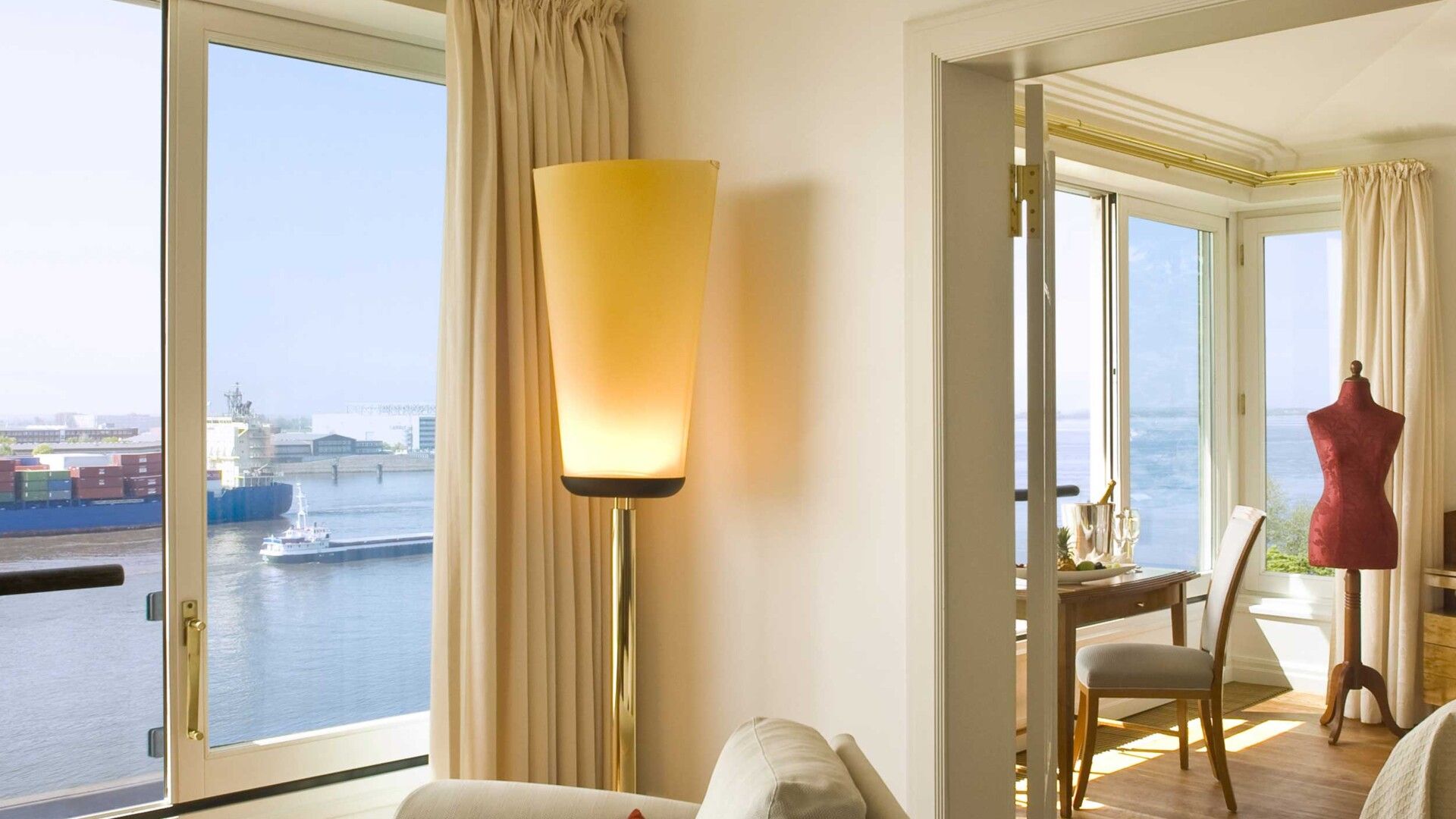 Entdecken Sie die Faszination unserer Elbzimmer, die Ihnen einen unvergleichlichen Weitblick auf die majestätische Elbe bieten. Mit ihren großen Fenstern schaffen sie ein lichtdurchflutetes Ambiente, das zum Entspannen einlädt. Ein begehbarer Kleiderschrank sorgt für zusätzlichen Komfort und unterstreicht das hochwertige Wohngefühl. Lassen Sie den Blick über das sanfte Wasser schweifen, während Sie die vorbeifahrenden Schiffe beobachten – ein Erlebnis, das Sie in seinen Bann ziehen wird.